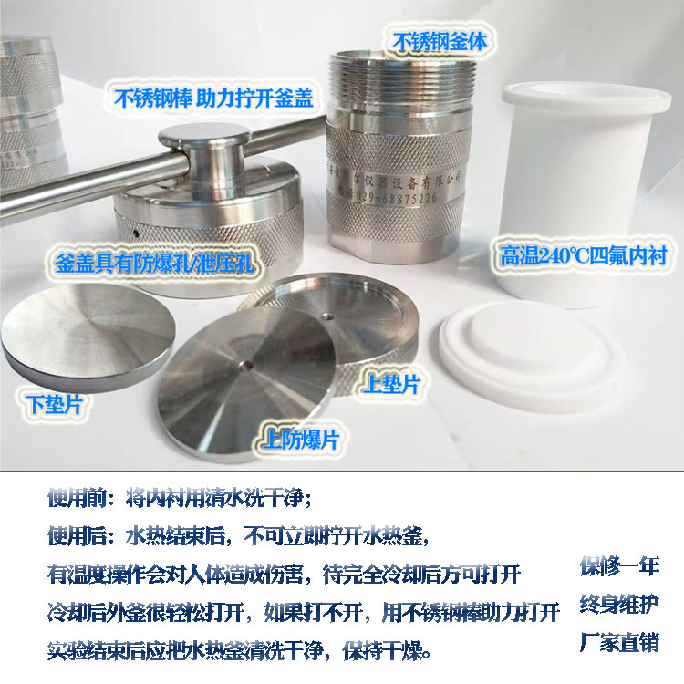应用于新材料、能源、环境工程等领域的科研试验中,是高校教学、科研单位进行科学研究的常用小型反应器。 水热合成反应釜特点: 1、手动螺旋紧固(扳手机械紧固)密封性能好; 2、使用方便:内杯采用卡槽型设计,易于清洗;内壁光滑,不挂水 3、空白值低,提高分析的准确度和精密度,降低了工作强度和对环境的污染。 4、使用温度:-180~+220℃,耐压:≤3Mpa 5、密封性能好,缩短实验分析时间 6、材质稳定,无黑点黄点开裂等隐蔽缺陷,提高实验的准确性和可重复性 7、内杯盖尖底设计,方便实验结束后样品收集 8、使用安全,结构合理,操作简单,外形美观 9、水热合成反应釜,内杯/外罐可编号,避免混淆方便实验,提高实验准确性,可重复性 值得信赖 水热法相关实验如晶体生长、材料制备等,均有相关领域的客户使用我厂反应釜,且得到*,我厂的反应釜设计融合客户的建议与要求,不断改善更新,进而更好的满足客户实验需求。您也可以根据特殊的实验要求定制配套的反应釜! 高温水热法的优点:粒子纯度高、分散性好、晶形好且可控制,生产成本低。用水热法制备的粉体一般无需烧结,这就可以避免在烧结过程中晶粒会长大而且杂质容易混入等缺点 |