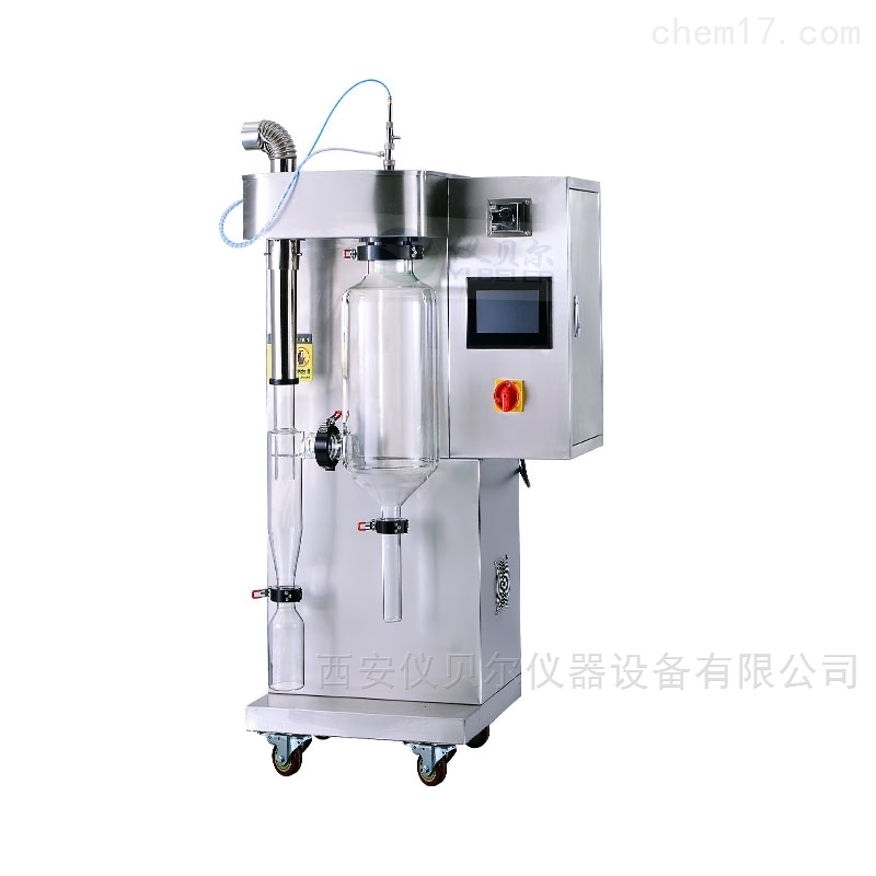 技术参数: ◆整机SUS304不锈钢材质,抗腐蚀性强 ◆空气压缩机:内置,静音型 ◆进风温度控制:30℃~300℃ ◆出风温度控制:30℃~140℃ ◆蒸发水量:1500mL/H~2500ml/h ◆进料量:50~2500ml/h(可调) ◆进料方式:蠕动泵调节 ◆控温精度:±1℃ ◆平均干燥时间:1.0~1.5S ◆喷嘴口径:0.5mm/0.7mm/0.75mm/1.0mm/1.5mm/2.0mm可选 ◆加热功率:3KW ◆整机功率:3.8KW /220V ◆外形尺寸:1300mm(高)×650mm(长)×500mm(宽) 主要特点 ●不锈钢喷头,效率高,雾化效果好 ●整机不锈钢材质,不生锈抗腐蚀 ●彩色LCD触摸屏参数显示:进风口温度/出风口温度/蠕动泵转速/风量/通针频率 ●设有喷咀清洁器(通针),在喷咀被堵塞时,会自动清除,通针的频率可自动调整 ●关机保护功能:关机时只需按停止键,机器除风机外立即停止运行,保证设备不会因为误操作(强行关风机)而导致加热部分烧坏 ●喷雾、烘干及收集系统采用透明的优质高硼硅耐热玻璃材料制造,使干燥过程在无污染的环境下进行 ●二流体喷雾的雾化结构,整机采用优质不锈钢材料制造,设计紧凑,无需附属设备 ●燥温度控制的设计上采用实时调控PID恒温控制技术,使全温区控温准确,加热控温精度±1℃ ●进料量可通过进料蠕动泵调节,最小样品量可达30ml ●干燥后的成品干粉,其颗粒度较均匀,95%以上的干粉在同一颗粒度范围 ●针对黏性物料,设有喷咀清洁器(通针),在喷咀被堵塞时,会自动清除,通针的频率可自动调整。 |