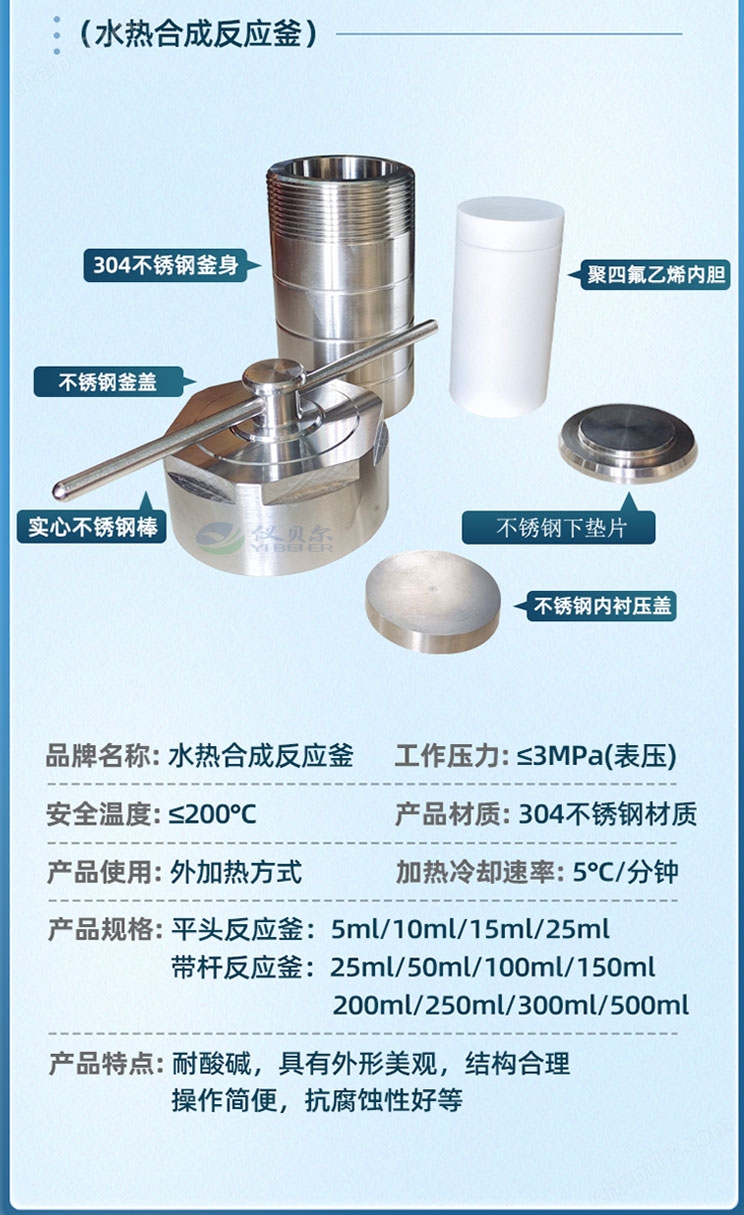 外壳材料国标304不锈钢内衬材料 PTFE 聚四氟乙烯材质耐压 3Mpa 温度设计温度220℃ 使用安全温度200℃ 规格 2ml3ml5ml10ml15ml25ml35ml50ml100ml150ml200m l250ml300ml500ml1000ml2000ml 非标可定制